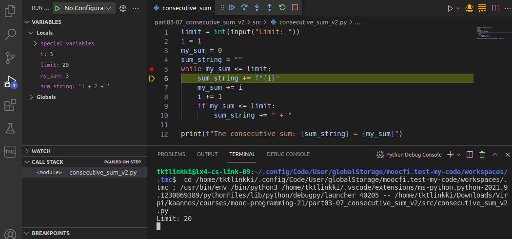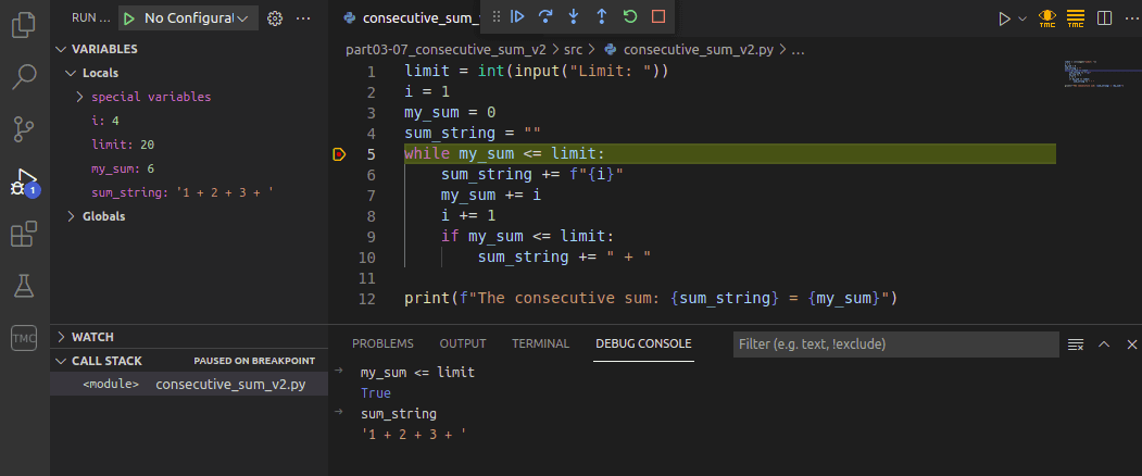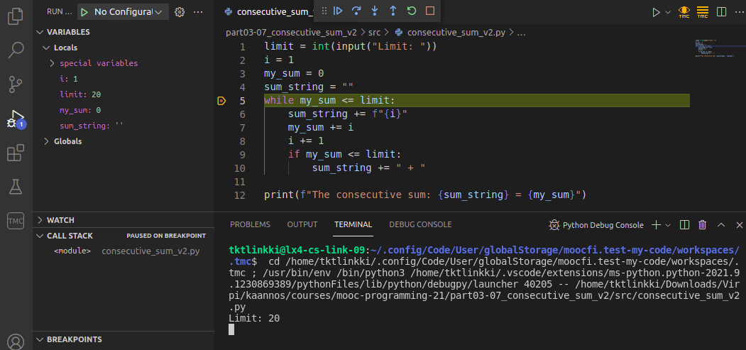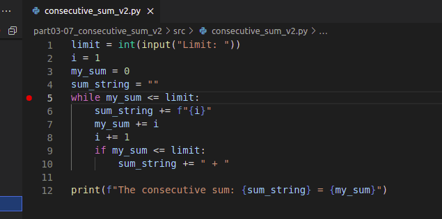 The following example is a slightly faulty attempt at solving the exercise The sum of consecutive numbers in the previous part. There is a breakpoint on line 5: