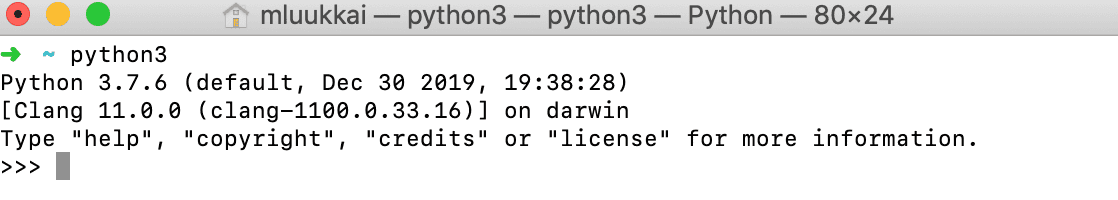 Starting up the interpreter may depend on your platform. In a Linux or Mac system, you can type in python3 in the terminal. In Windows, the command on the command line might be python. Firing up the interpreter on a Mac looks like this: