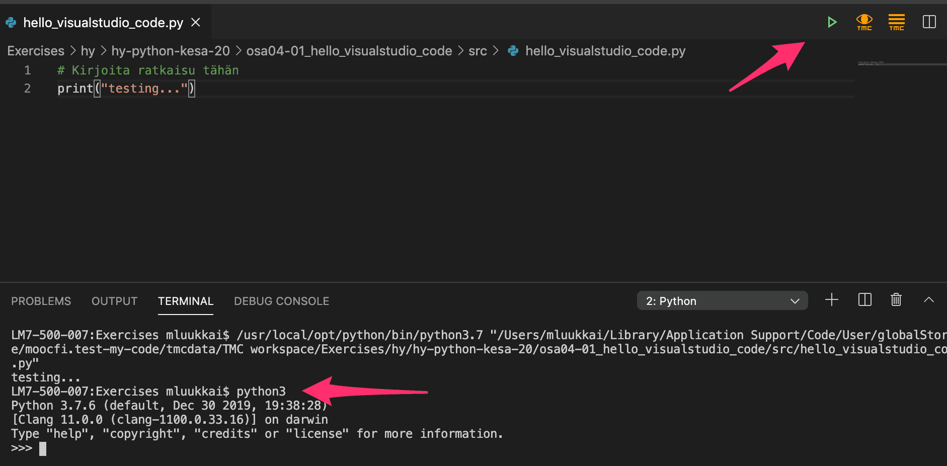 It is also possible to start the interpreter inside Visual Studio Code. First you should execute a program by clicking on the triangle. This should open a Terminal section on your screen, where you can now type in python3 (or python):