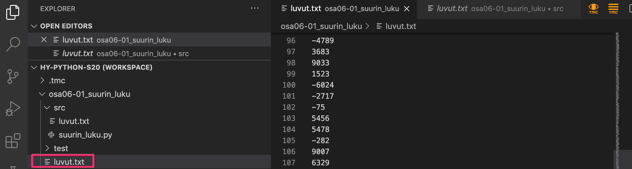 There is a line break \n at the end of each line in the file, but the print function also adds a line break by default. There are no extra line breaks in the printout above, because the line breaks at the ends of the lines are removed with the replace method. It replaces each line break character with an empty string. This way the lengths of the lines are also calculated correctly.