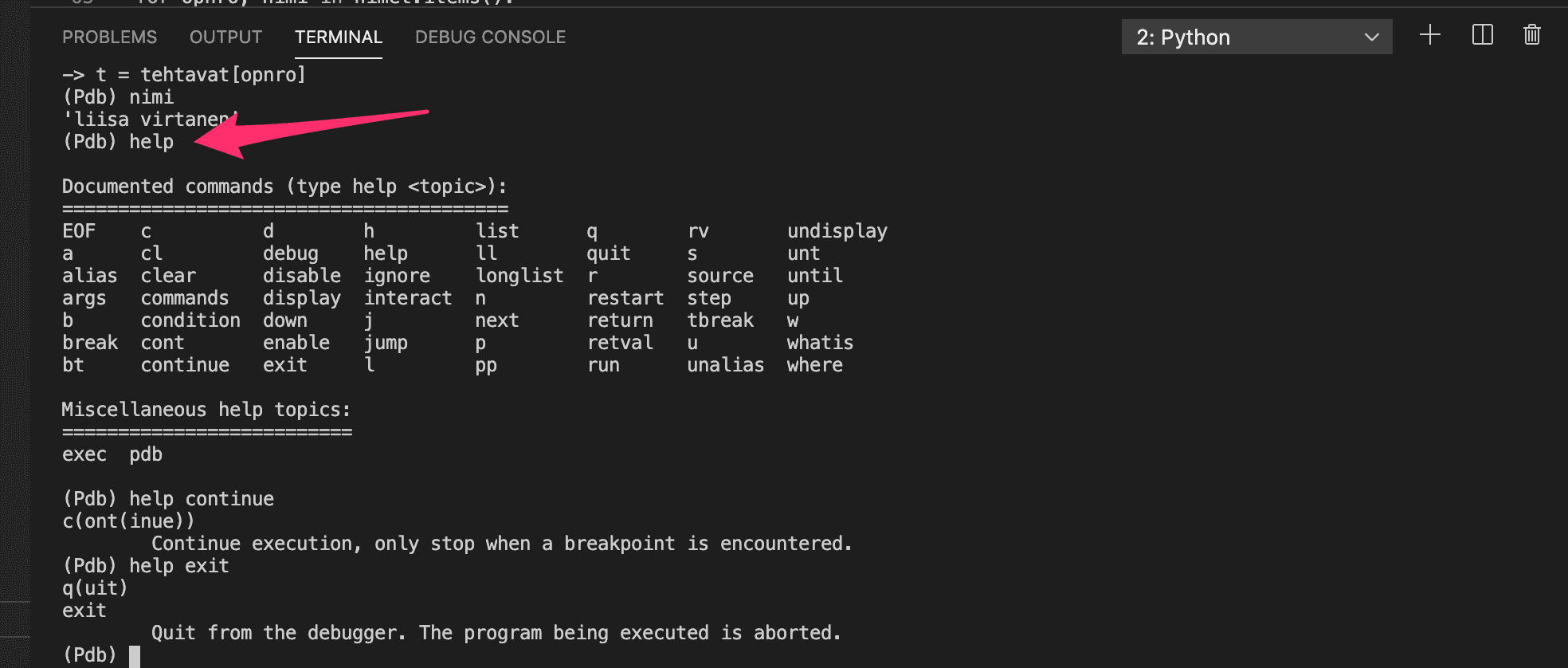 There are also some other commands available in the debugging console. You may find them here, or else you can type in help in the debugging console: