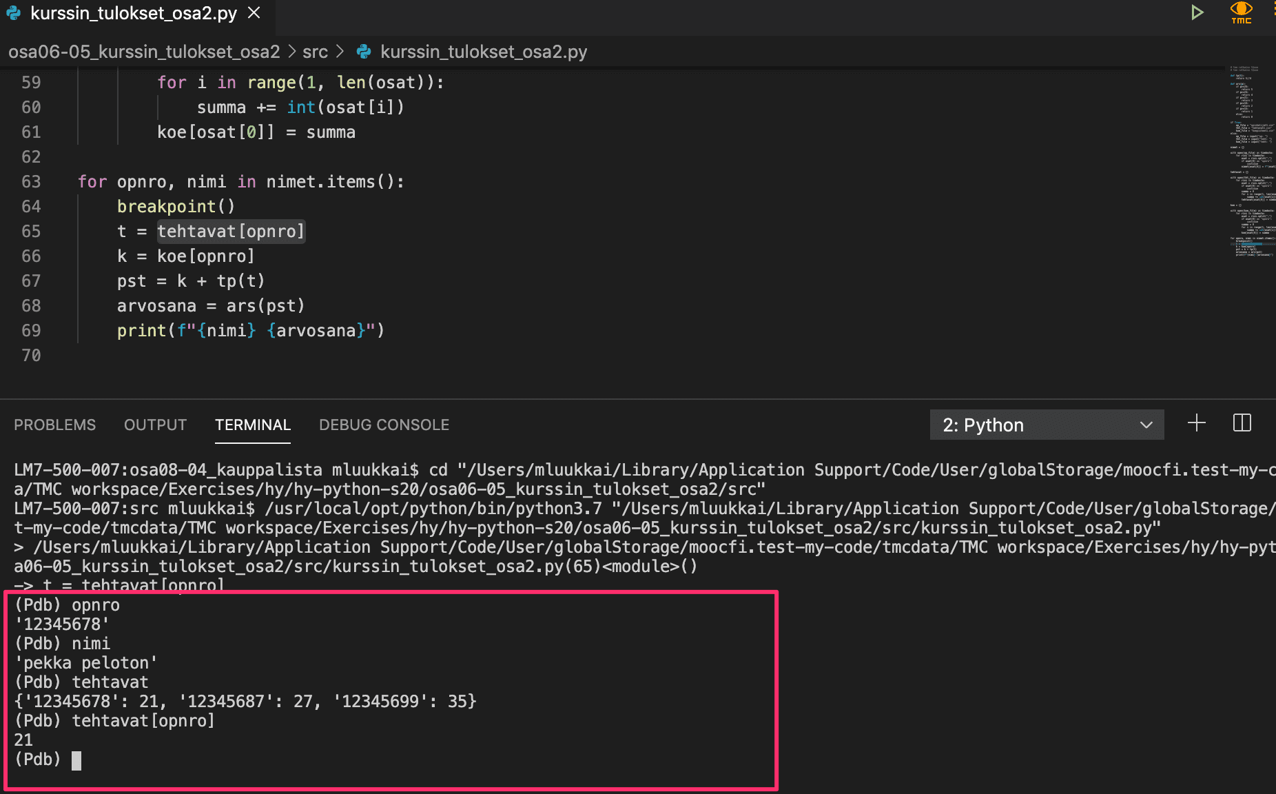 You can add this command to any point in your code (within normal syntactic rules, of course). When the program is run, the execution halts at the point where you inserted the breakpoint command. Here is an example of debugging efforts when completing one of the exercises from the previous part (please ignore the Finnish variable names in the images, and concentrate on the functionality):